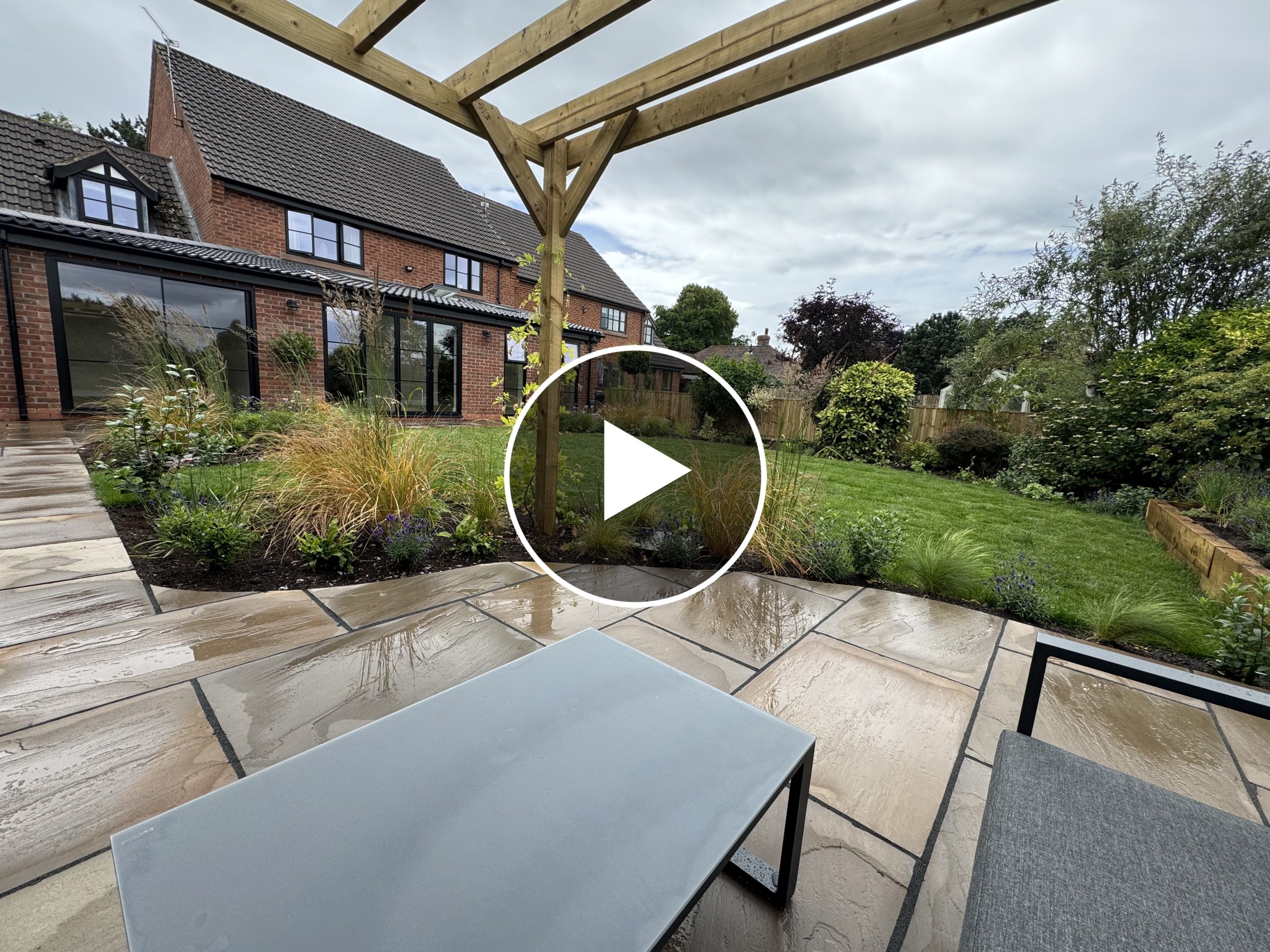 Joanne and Scott commissioned Olive Tree to transform their neglected, overgrown garden post-renovation into a country cottage and nature-friendly haven. We designed a new space featuring a riven Raj blend sandstone patio that wraps around the house, guiding to a pergola at the garden's end, supporting an existing wisteria.